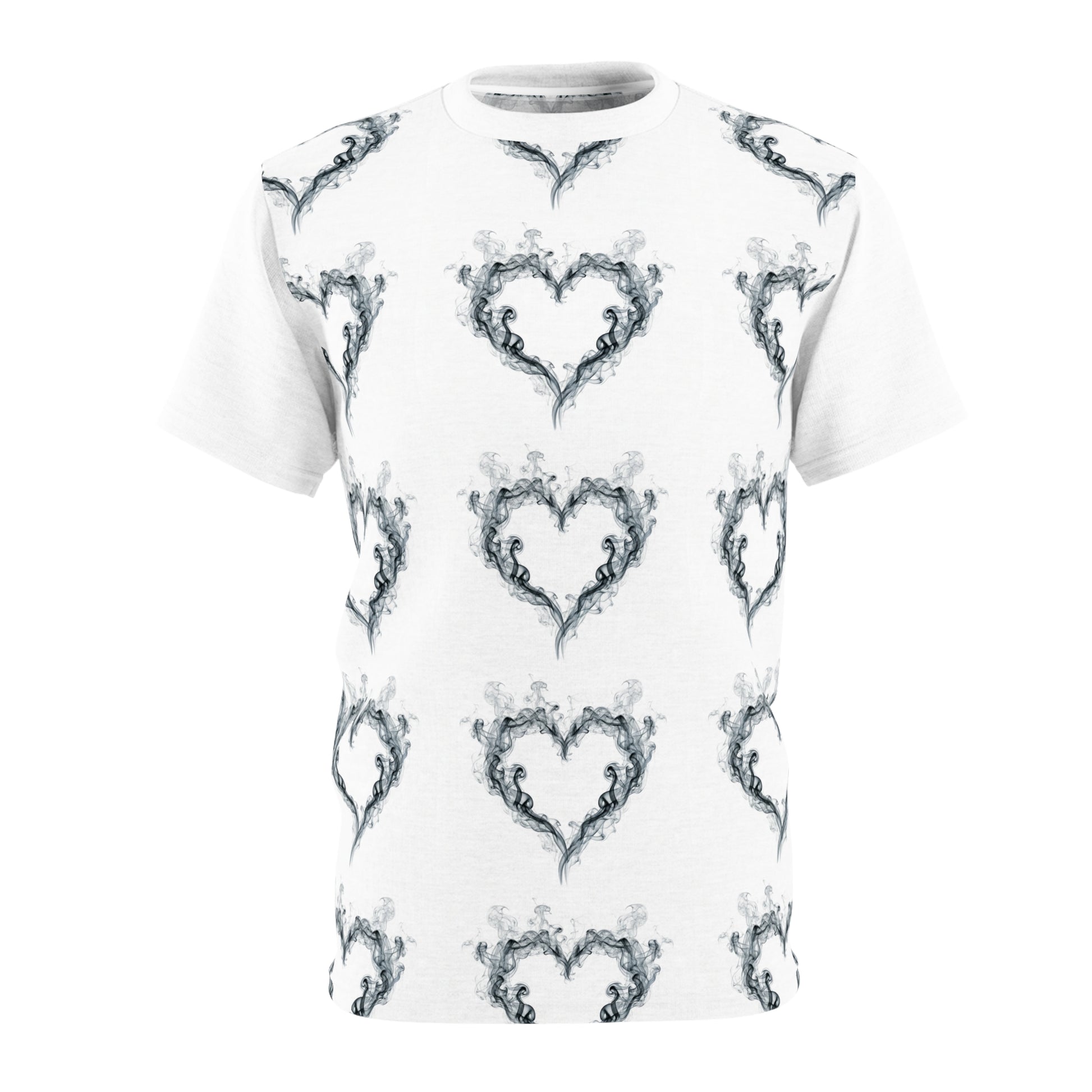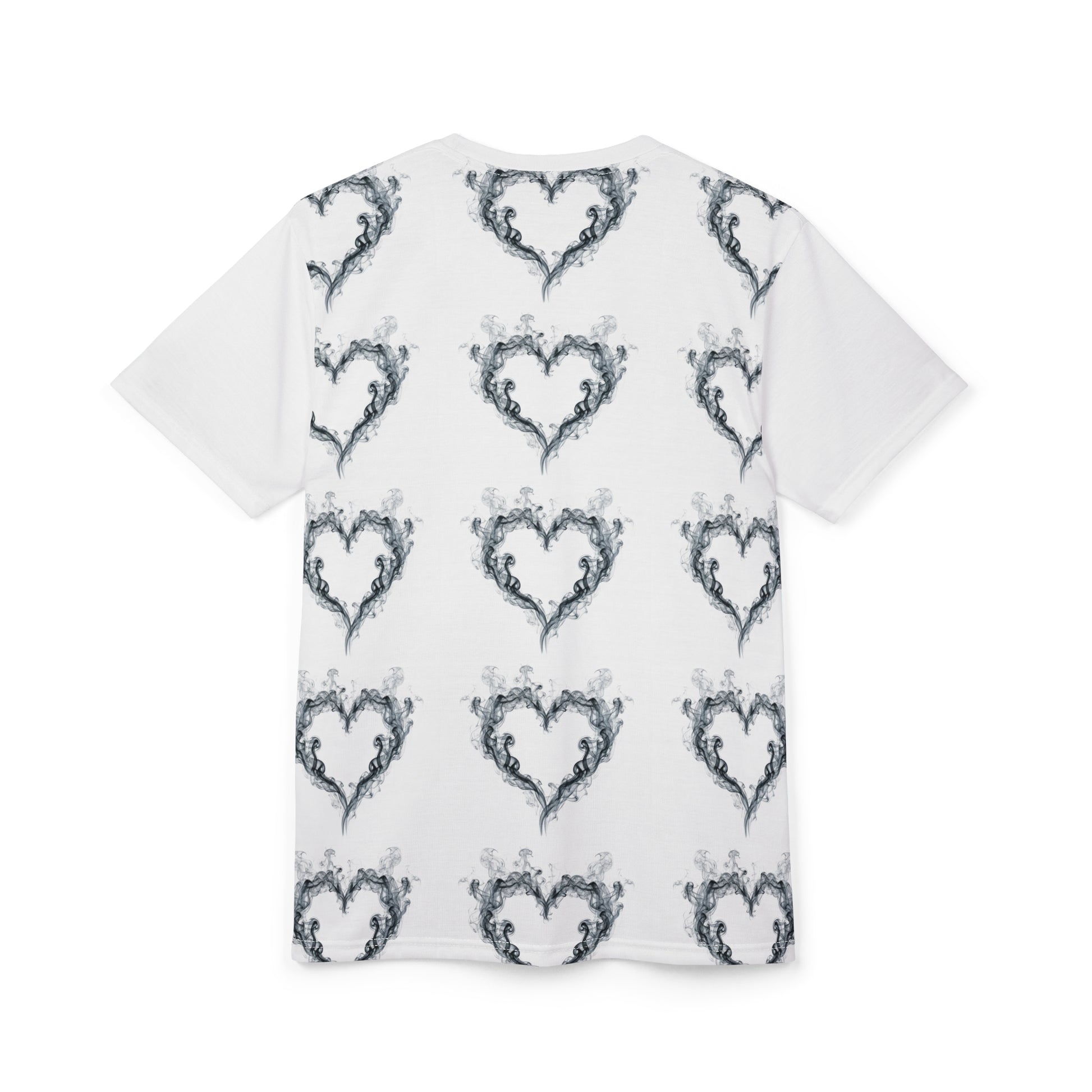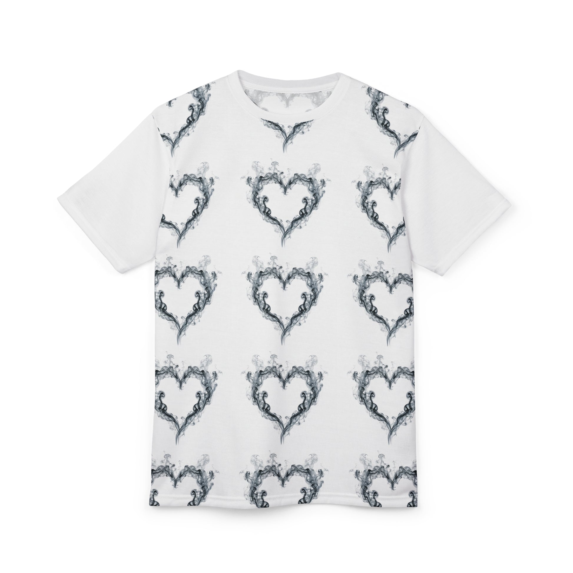 This all-over printed tee wraps the wearer in a quiet, smoky romance. Soft gray heart motifs, formed from delicate wisps of smoke, repeat across a clean white canvas—subtle, modern, and a little mysterious. The regular cut and tagless finish keep the focus on the pattern and comfort. Wear it when you want clothing that feels like an intimate whisper: layered under a denim jacket for coffee runs, paired with linen trousers for slow weekend walks, or kept close during late-night playlists and candlelit conversations. The lightweight polyester holds the print’s crisp detail while remaining easy to care for and quick to dry. It’s a wearable mood—minimal, moody, and distinctly personal.